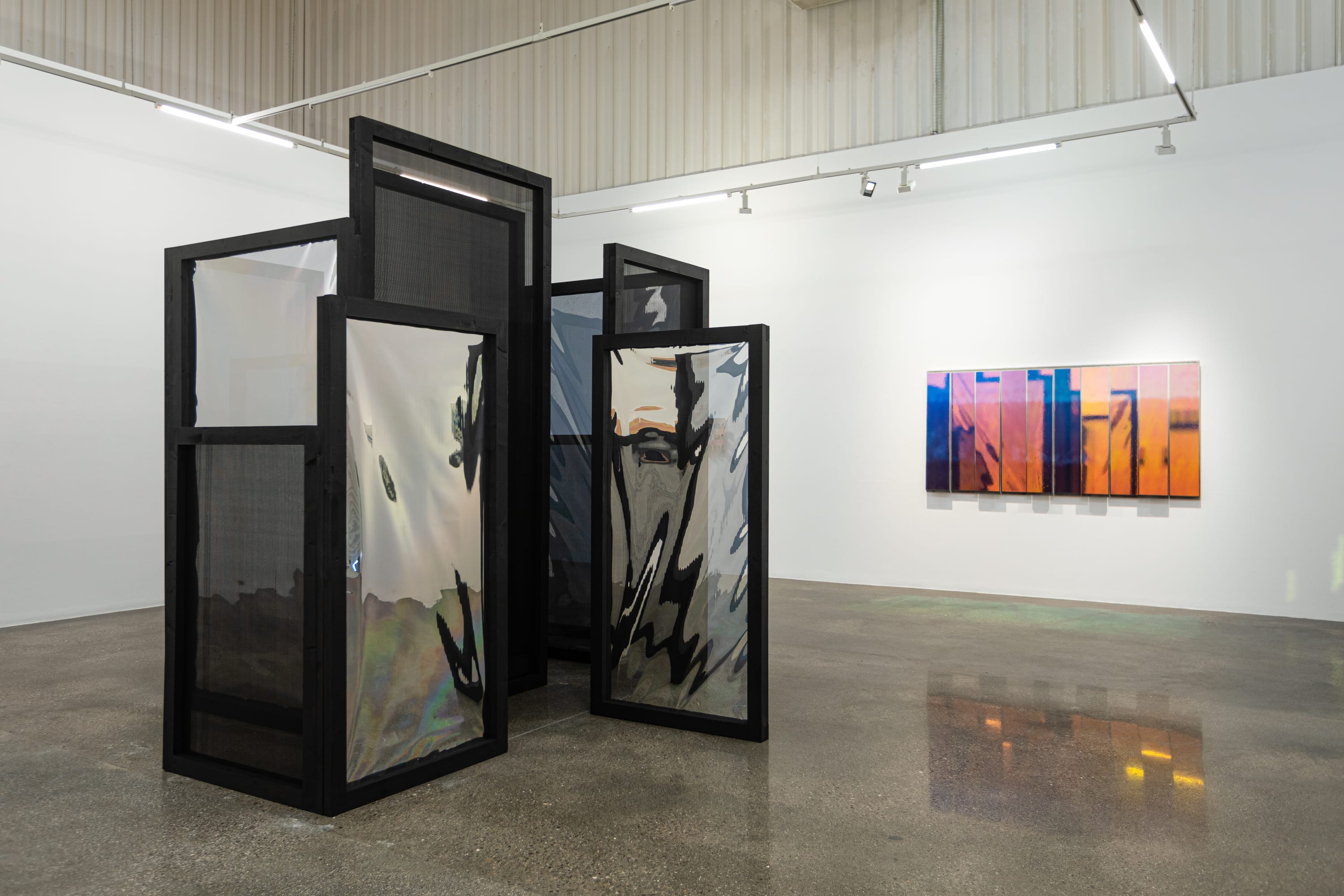 IN FRACTURED LANDSCAPES RACKOWE PRESENTS FRACTURED CITY, AN INSTALLATION CONCEIVED TO OCCUPY THE CENTRAL FLOOR OF THE GALLERY AROUND WHICH VISITORS CIRCULATE. IT DEVELOPS HIS WORK EXPANDED LANDSCAPES, 2022 WHICH WAS COMMISSIONED FOR THIS YEAR’S SUMMER LIGHTS FESTIVAL AT CANARY WHARF, LONDON. THE INSTALLATION CONSISTS OF SILVER REFLECTIVE FILM AND BLACK BUILDING NETTING PANELS EXTENDED BETWEEN BLACK TIMBER RECTANGULAR FRAMES ARRANGED TO INTERSECT AT VARIOUS HEIGHTS ACROSS THE GALLERY FLOOR: THE FORM AND REFLECTIVITY OF THE INSTALLATION ECHOES THE BUILT ENVIRONMENT OF HIGH-RISE CITY CENTRES WHERE SURFACE, COLOUR, TRANSPARENCY AND FORM COME TOGETHER TO ACT AS AN EXPANSIVE COUNTERPOINT TO THE ADJACENT ARCHITECTURE.