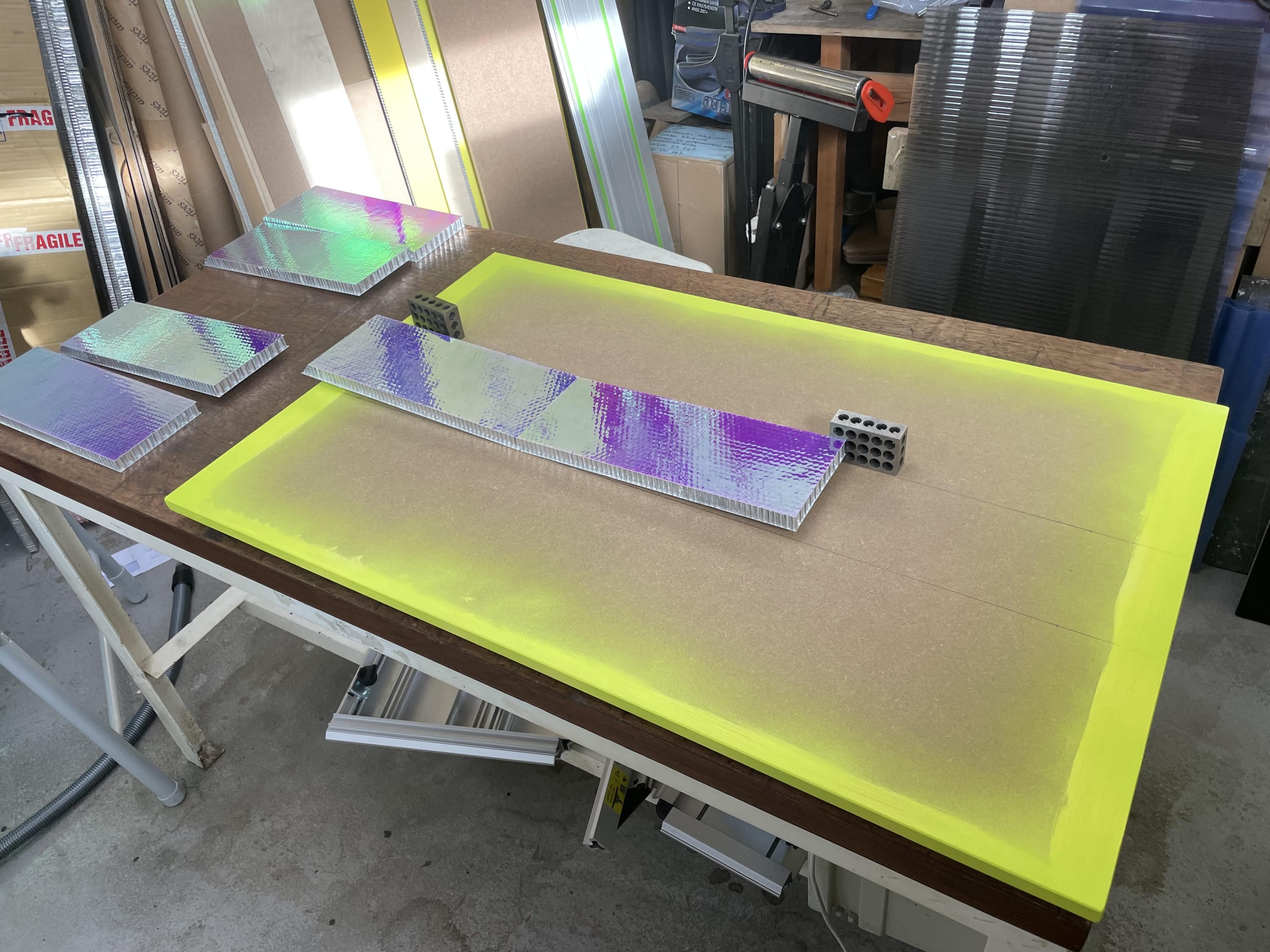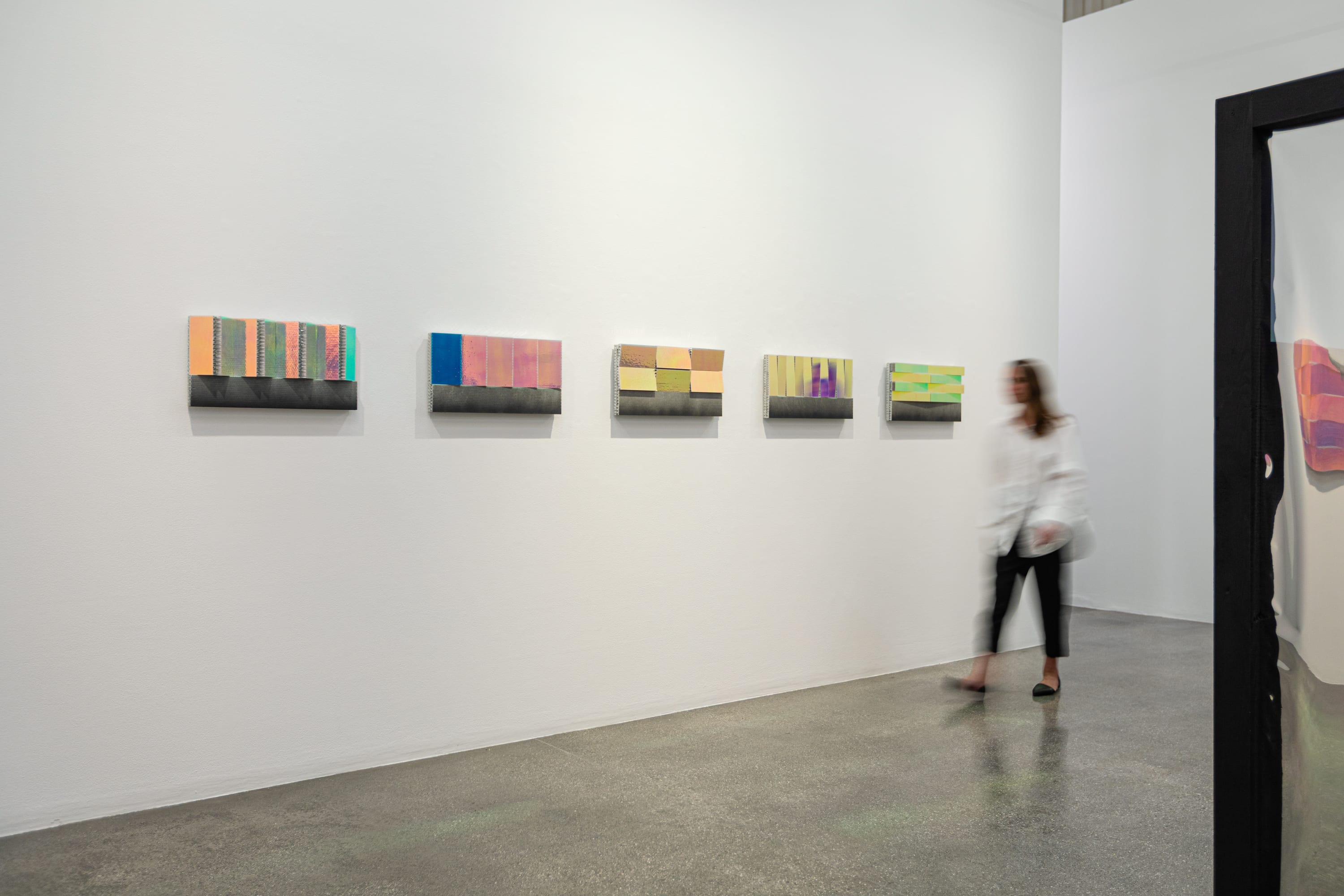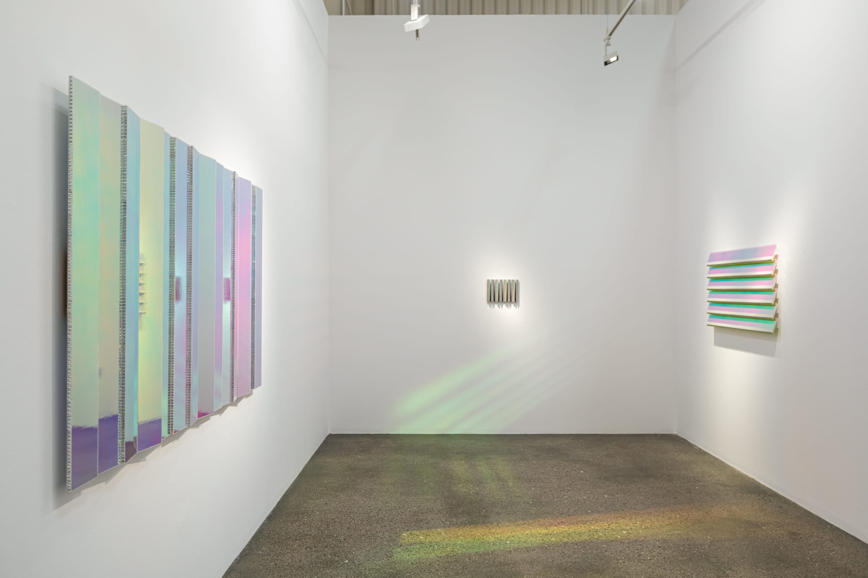 IN HIS NEW WALL SCULPTURES RACKOWE EMPLOYS RAW MATERIALS TO CREATE ANGLED SMOOTH SURFACES THAT ALTER WITH EACH MOVEMENT BY THE VIEWER. ALUMINUM HONEYCOMB GRP SHEETS, A MATERIAL MORE COMMONLY FOUND IN AIRCRAFT, FORM THE BASIS OF HIS ASSEMBLAGES, THEIR INTRICATE HONEYCOMB CONFIGURATION EXPOSED ON THE SIDEVIEW OF THE SCULPTURES. THESE SHEETS ARE LAYERED WITH DICHROIC FILM, A MATERIAL THAT CREATES STIMULATING COLOUR EFFECTS THAT BEND THE COLOUR OF LIGHT AS YOU MOVE AROUND THEM. THE ARRANGEMENTS VARY IN SIZE AND FORM – AT TIMES THEY ARE POSITIONED HORIZONTALLY TO RESEMBLE VENTS, VERTICALLY TO CREATE MULTIPLE REFLECTIONS OR WITH VARIATIONS IN THEIR SYMMETRY TO CREATE FLUIDITY AND MOTION. TOGETHER THEY CREATE PLAYFUL AND ENERGISING EFFECTS – BRIGHT VIVID SURFACES THAT ARE IN CONSTANT MOTION.