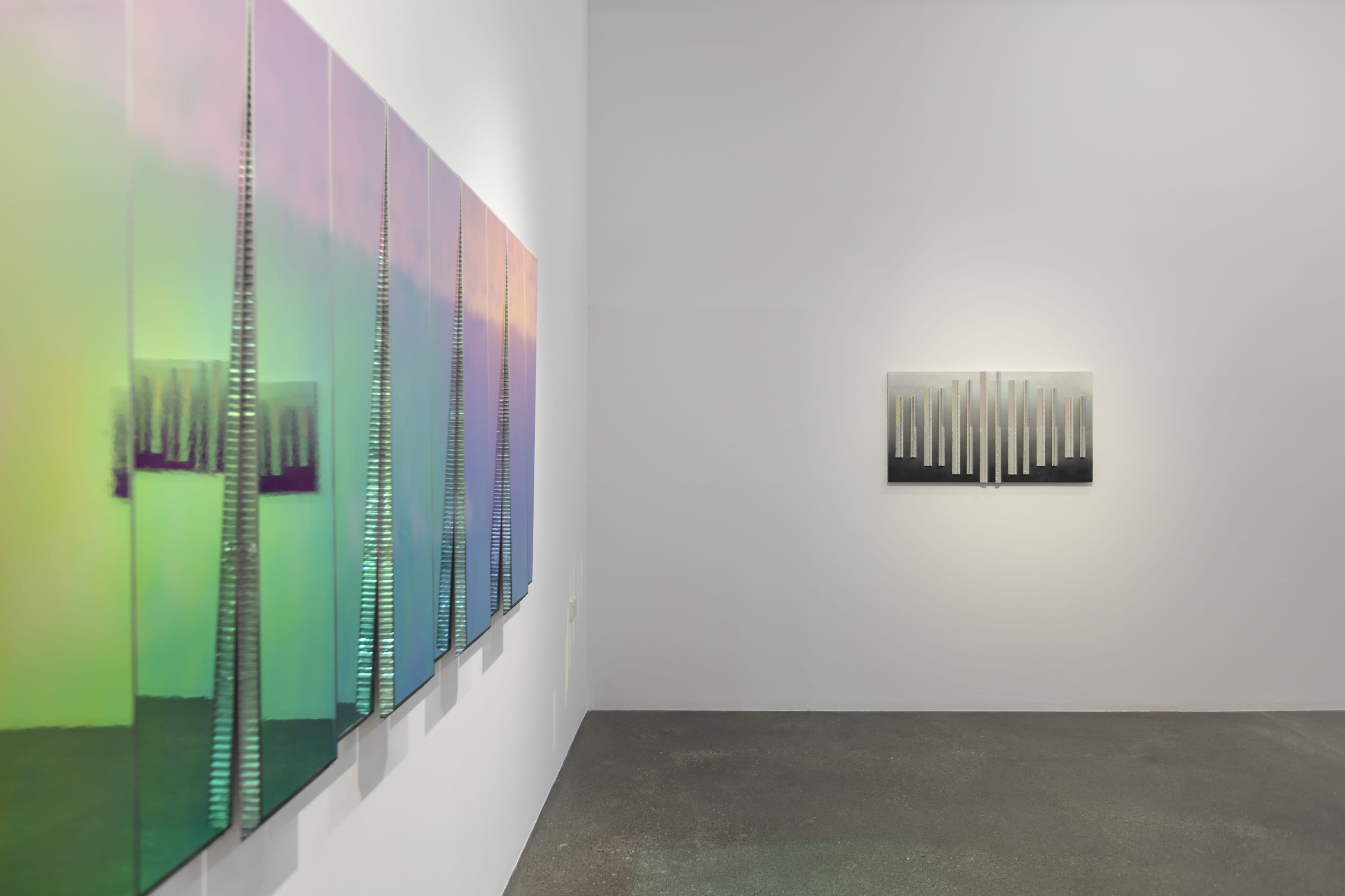 FRACTURED LANDSCAPES IS A SOLO EXHIBITION BY LONDON ARTIST NATHANIEL RACKOWE, HIS THIRD EXHIBITION AT THE GALLERY. RACKOWE’S PRACTICE SPANS PUBLIC ART, INSTALLATION, SCULPTURE, CONTEMPORARY DANCE AND PAINTING; INVESTIGATING FORM AND MATERIALITY THROUGH HIS OBSERVATIONS OF LIGHT AND THE EFFECT ITS VICISSITUDES HAVE ON OUR EXPERIENCES OF URBAN SPACES. WHEREAS IN PREVIOUS EXHIBITIONS RACKOWE WORKED WITH LIGHT AS A SOURCE (EMBEDDING NEON TUBES INTO HIS SCULPTURES) IN THIS EXHIBITION HE CONSIDERS THE NOTION OF LIGHT (ARTIFICIAL AND NATURAL) AS A REFLECTOR - THESE WORKS EXPLORE HOW LIGHT BOUNCES ACROSS OBJECTS TO GUIDE OUR SENSATION OF SPACE, MATERIAL AND COLOUR.