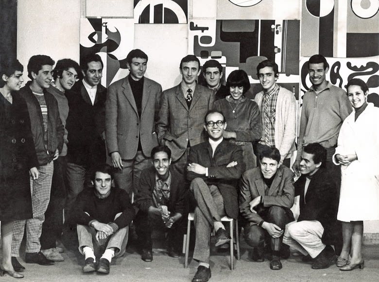 Mohamed Melehi (in chair) at the Casablanca Art School with a group of teachers (including Mohammed Chabâa and Farid Belkahia) and students (among them, on the far right, Malika Agueznay). Photograph by Toni Maraini. Photo: Courtesy of Malika Agueznay -